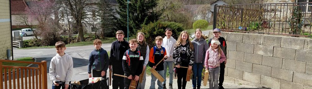 Von Gründonnerstagabend bis Karsamstagabend ließen insgesamt 11 Kinder dreimal täglich ihre Ratschen erklingen – um 06:00 Uhr in der Früh, zu Mittag um 12:00 Uhr und am Abend um 18:00 Uhr. Mit großem Einsatz und hörbarer Begeisterung machten sie in ganz Lembach auf sich aufmerksam.
